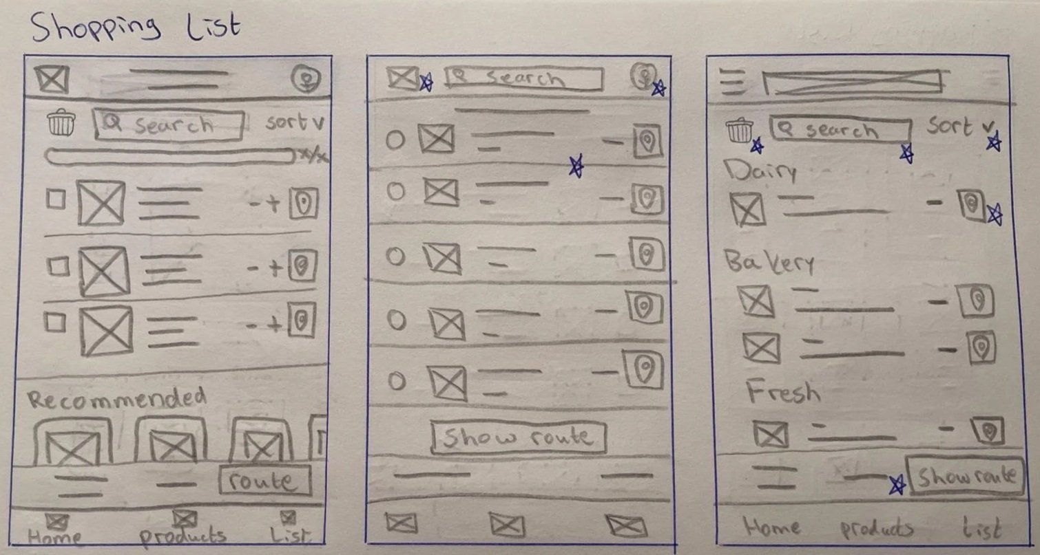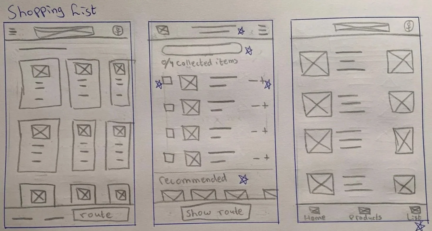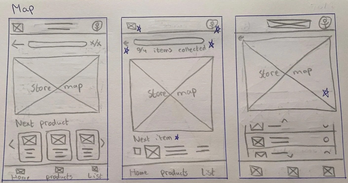 For each screen I sketched five variations and combined the strongest elements into a single wireframe. Shown below are 2 examples of this method for the shopping list and map pages.