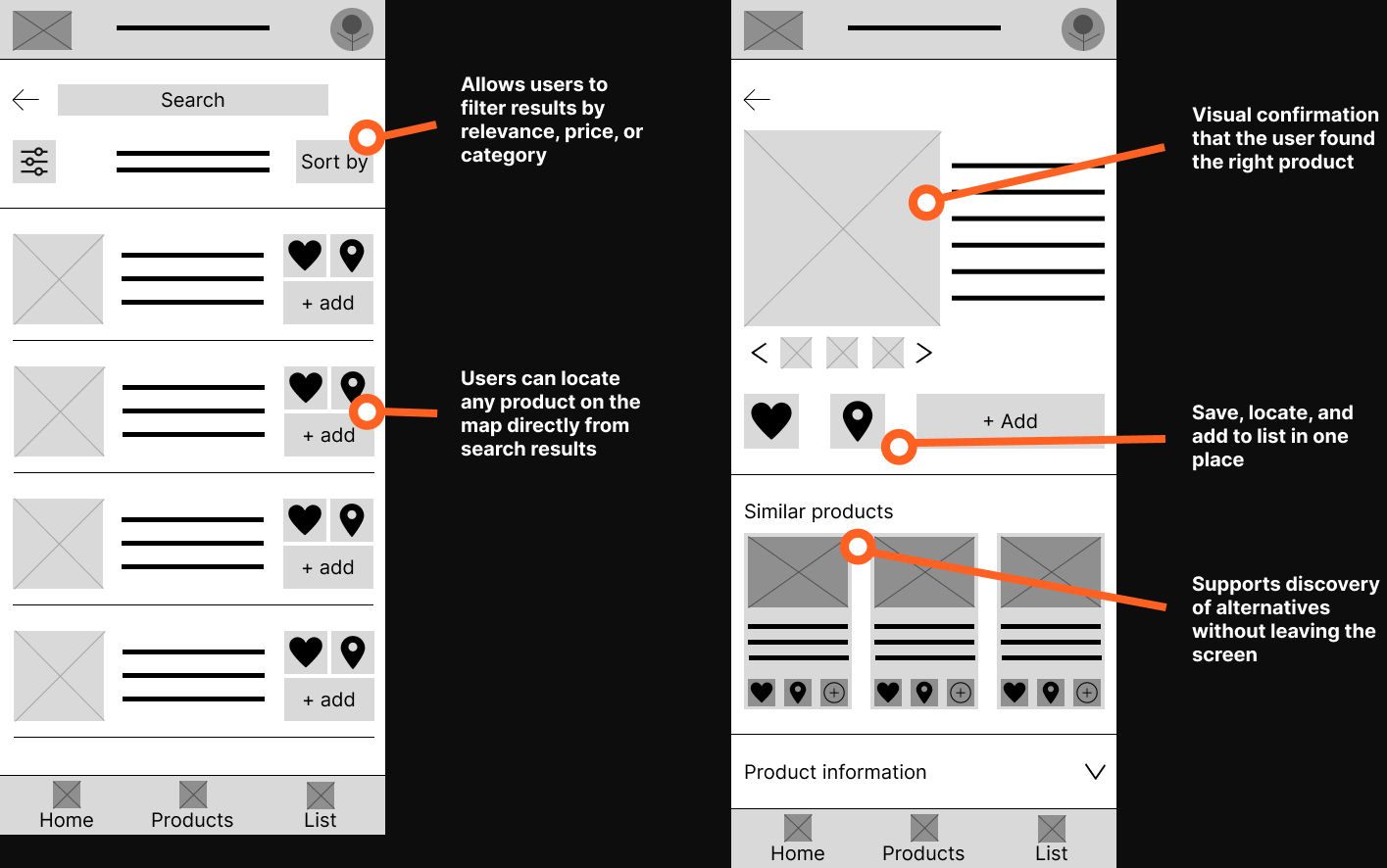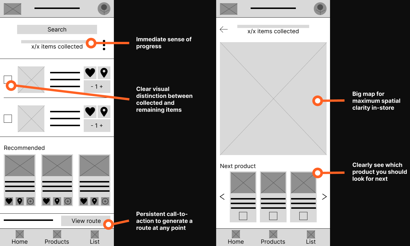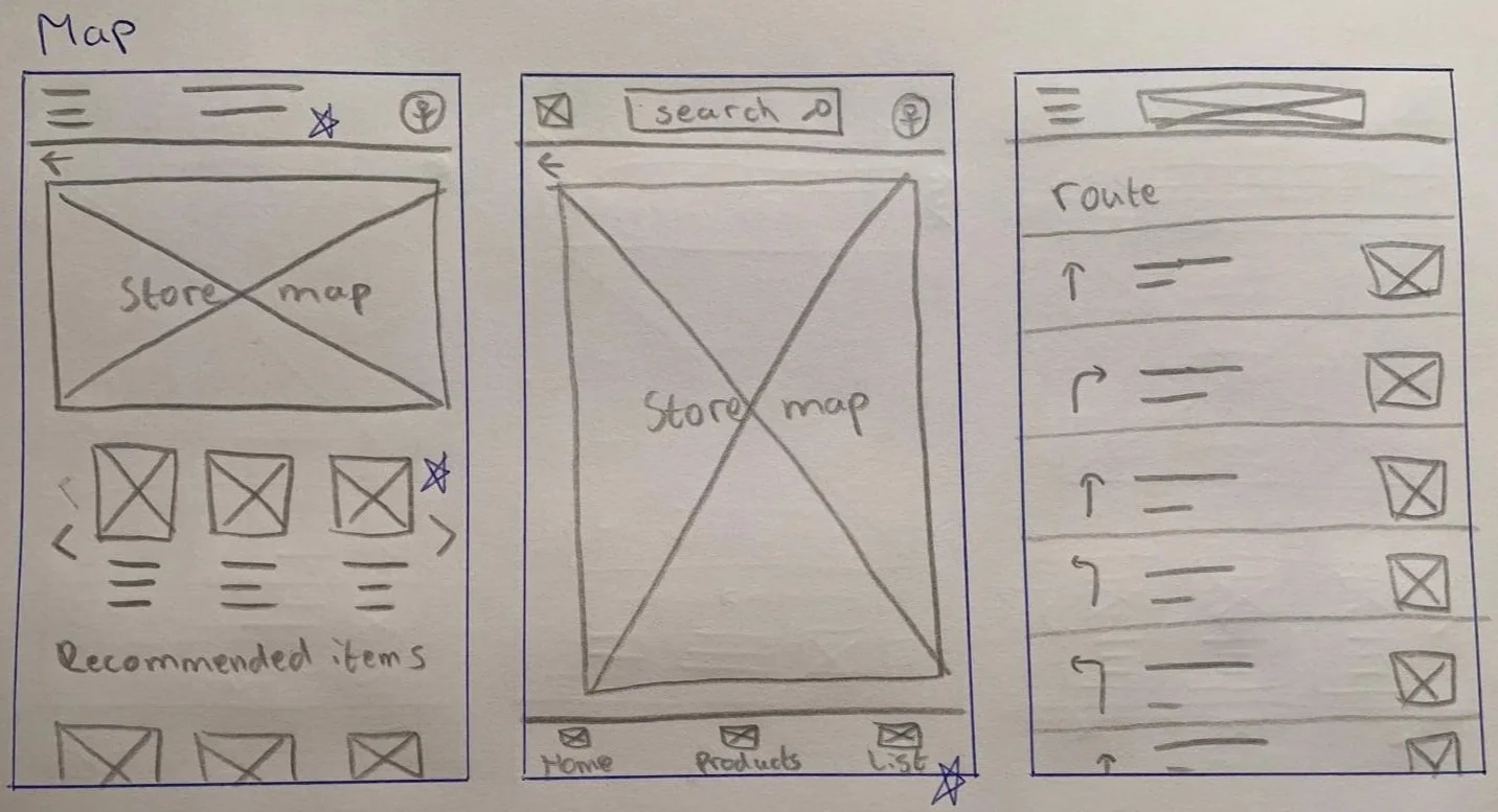 For each screen I sketched five variations and combined the strongest elements into a single wireframe. Shown below are 2 examples of this method for the shopping list and map pages.