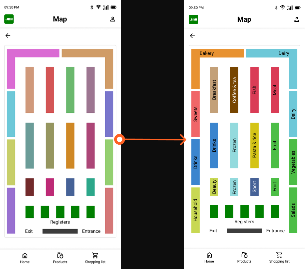 The map now includes labeled aisles, and each section is color-coded to match the product categories (e.g., green for fruits, vegetables, and salads; light blue for frozen items; and yellow for pasta and rice). This helps users quickly understand the store layout at a glance.