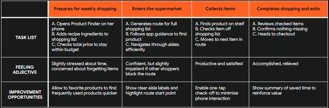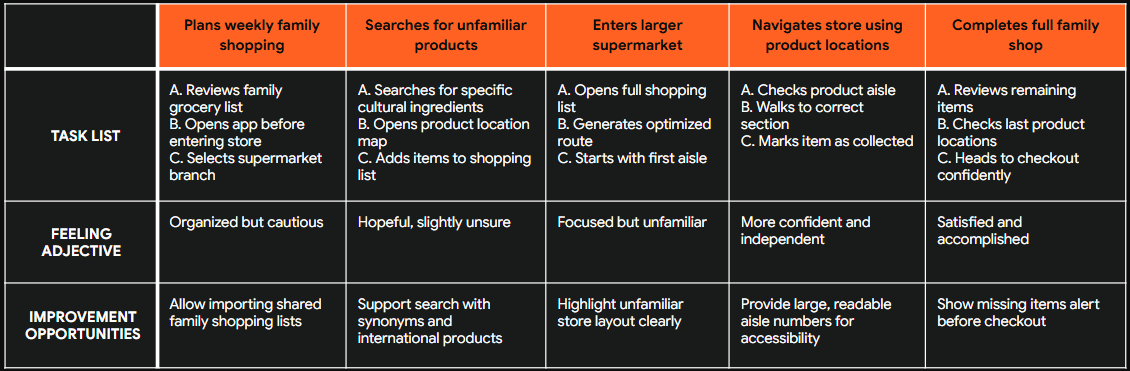 “As a parent doing weekly family groceries in different supermarkets, I want to search for specific products and see exactly where they are located, so that I can shop confidently and avoid walking through the entire store.”