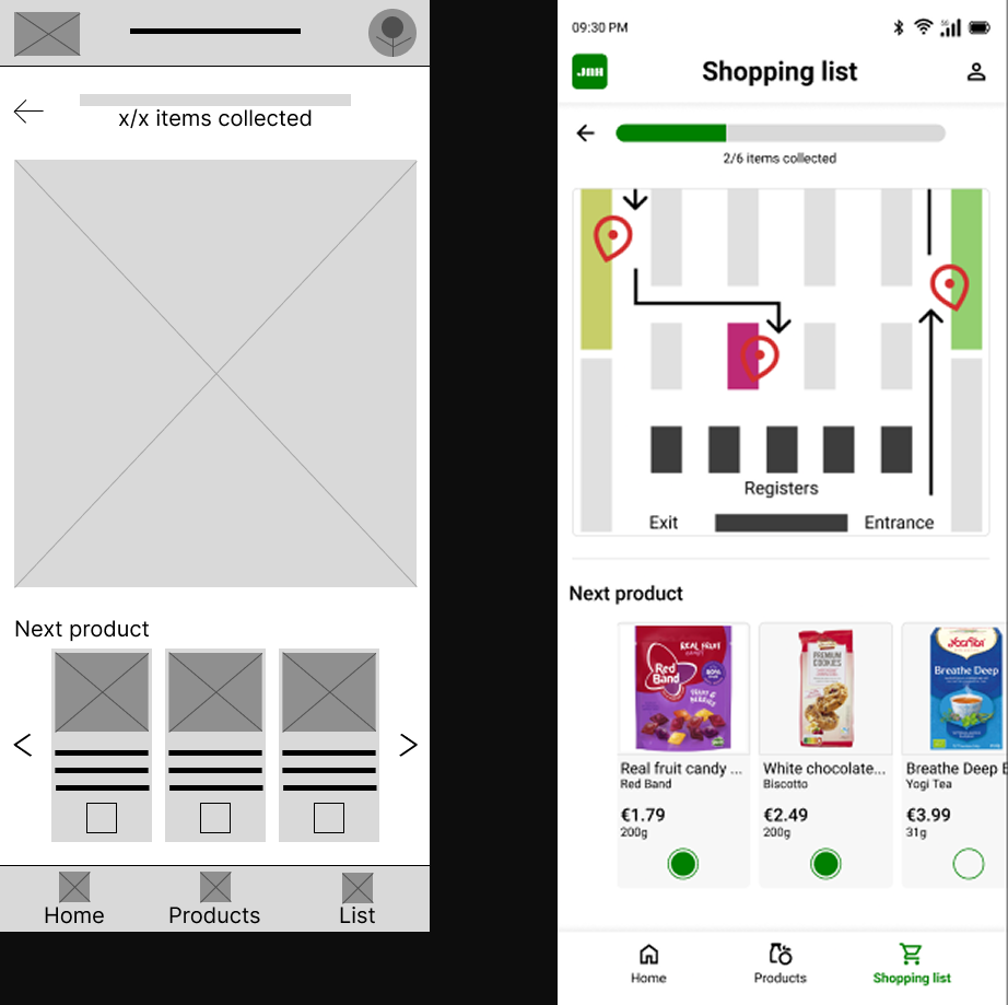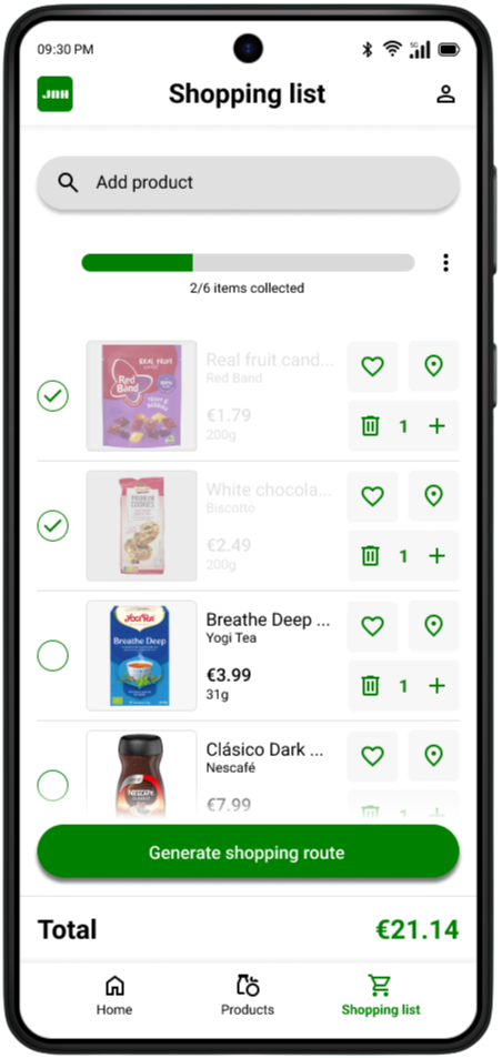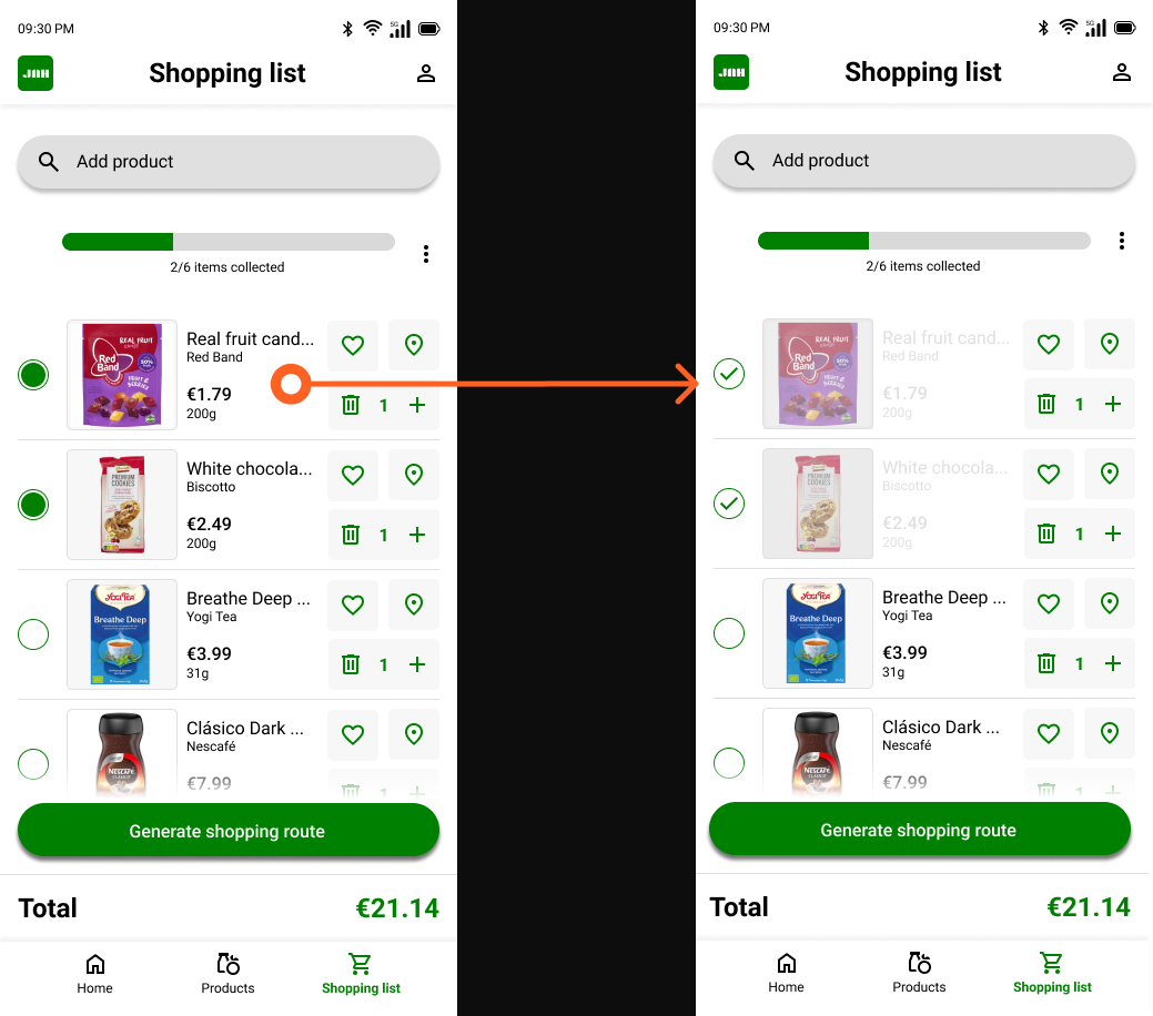 To make it clearer which products have already been collected, the product image and description are displayed in light gray once an item is checked off. This makes it easier and faster to distinguish between collected and remaining items. Additionally, the green indicator dot was replaced with a checkmark to provide a clearer visual confirmation that a product has been collected.