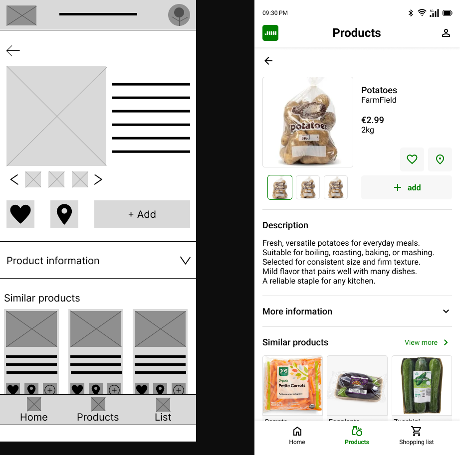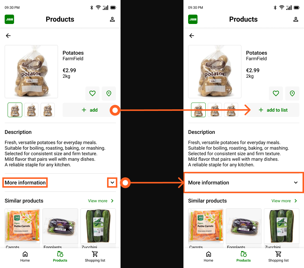 The original “+ Add” button was replaced with a “+ Add to list” button to more clearly indicate where the product will be added. Additionally, the separate “More information” and arrow-down buttons were combined into one full-width button. This change makes it clearer and easier for users to access additional product information.