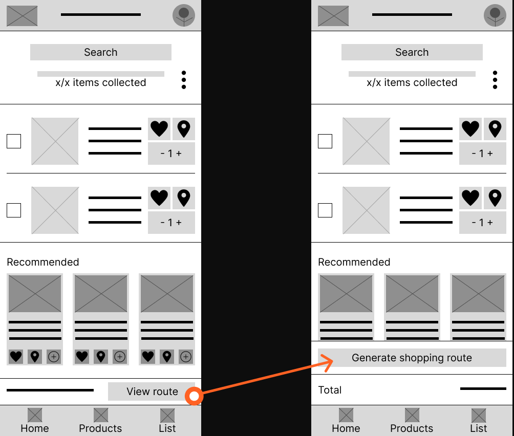 The original “View route” button was small and easy to miss. It was redesigned into a larger sticky “Generate shopping route” button to improve visibility, emphasize the primary action, and better communicate what the feature does.
