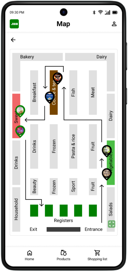 When a user creates a shopping list, the app automatically generates an optimal walking route through the store.
