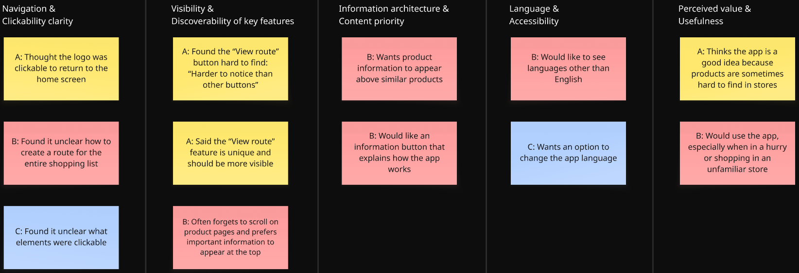 Observations from the recorded sessions were organized into an affinity diagram to identify patterns across participants.