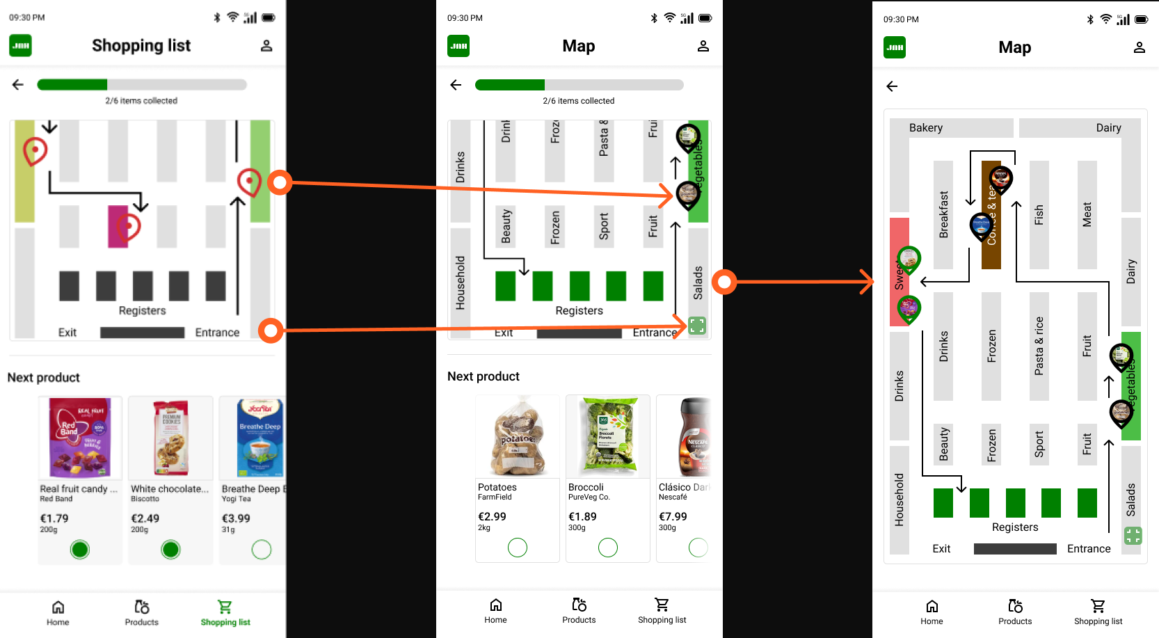 The high-fidelity mockups below illustrate the main user flow, from opening the app on the home screen to generating an optimized in-store shopping route. Each screen reflects the design decisions and improvements made following the lo-fi usability study.