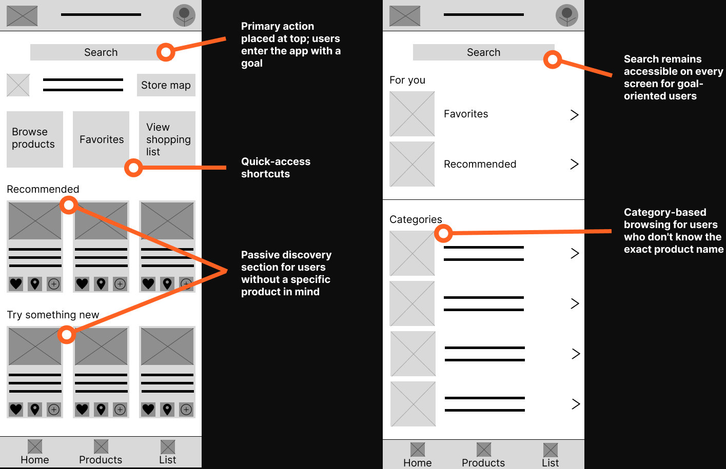 This project originated from the Google UX Design course on Coursera, where designing a product finder app for supermarket shoppers was one of the suggested prompts. Because the project brief was predefined, no prior user research was conducted. The painpoints and personas in this case study are therefore assumption-based proto-personas rather than research-validated. However, both rounds of usability testing were conducted with real participants, grounding the design iterations in genuine user feedback.